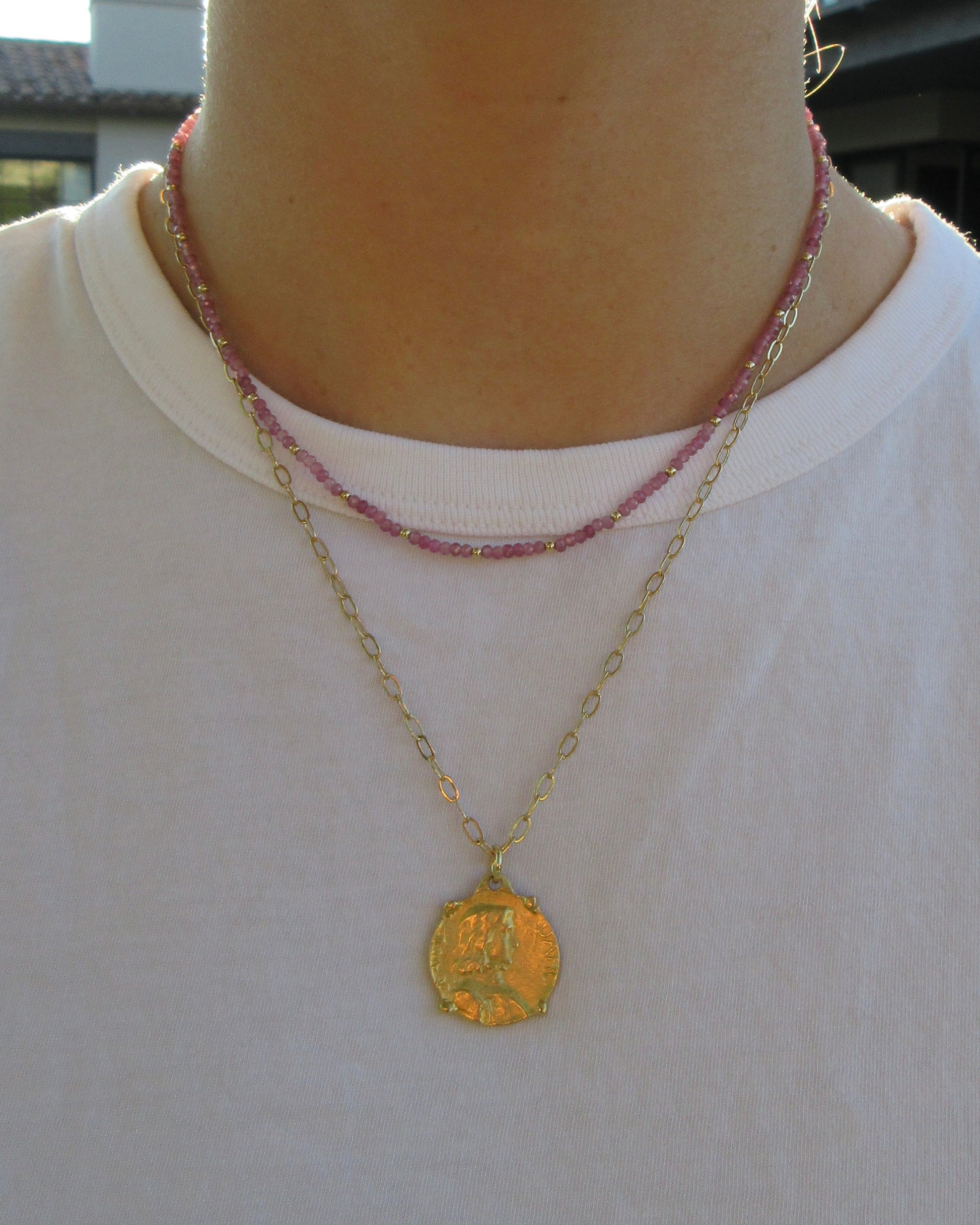 Handmade beaded necklace made with real pink tourmaline gemstone beads and gold filled beads.
