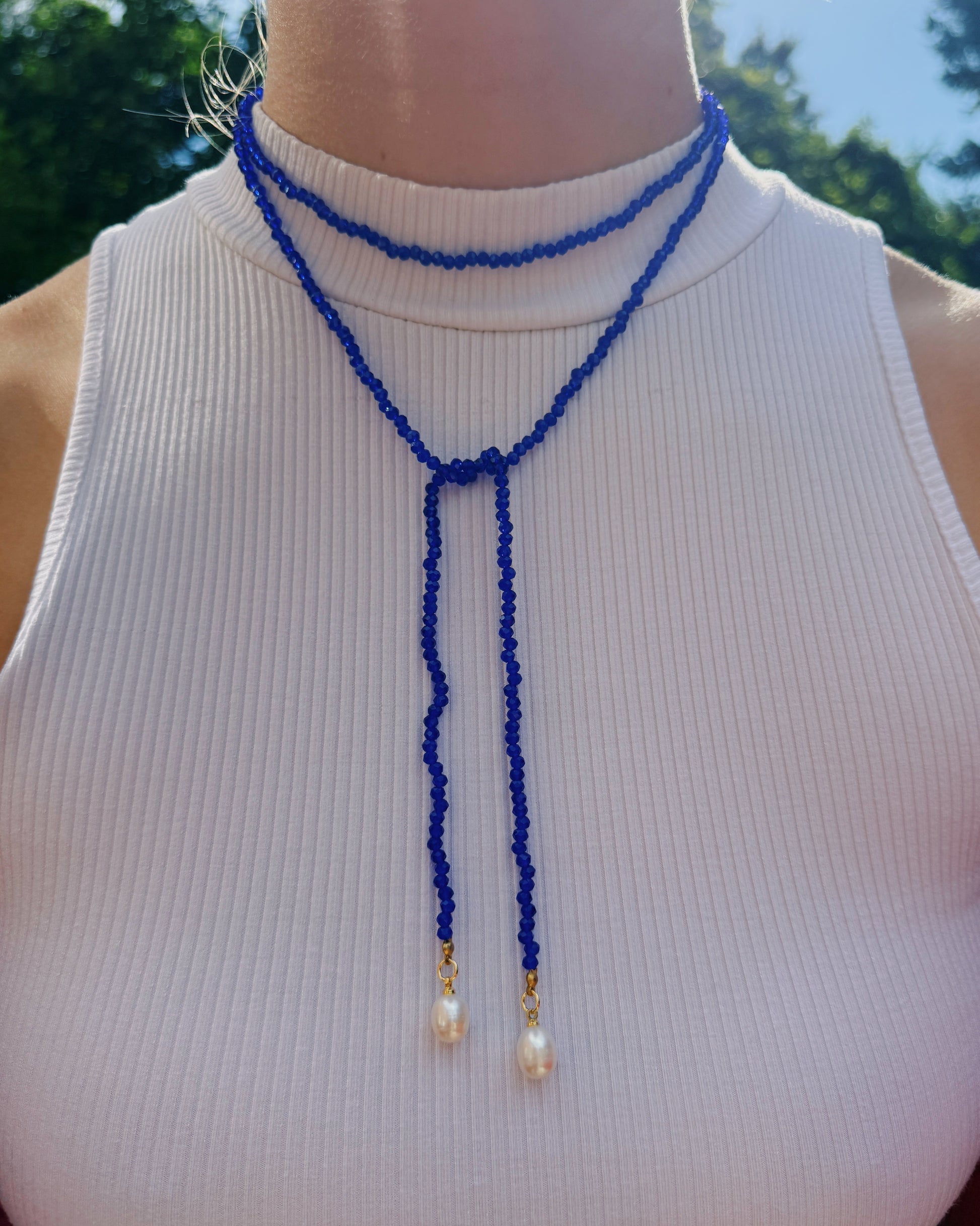 Introducing The Classic Navy! A wrap beaded necklace featuring 3mm navy rondelle beads, finished with two freshwater pearls at the ends. Perfect for gameday or everyday wear! Can be worn so many different ways!